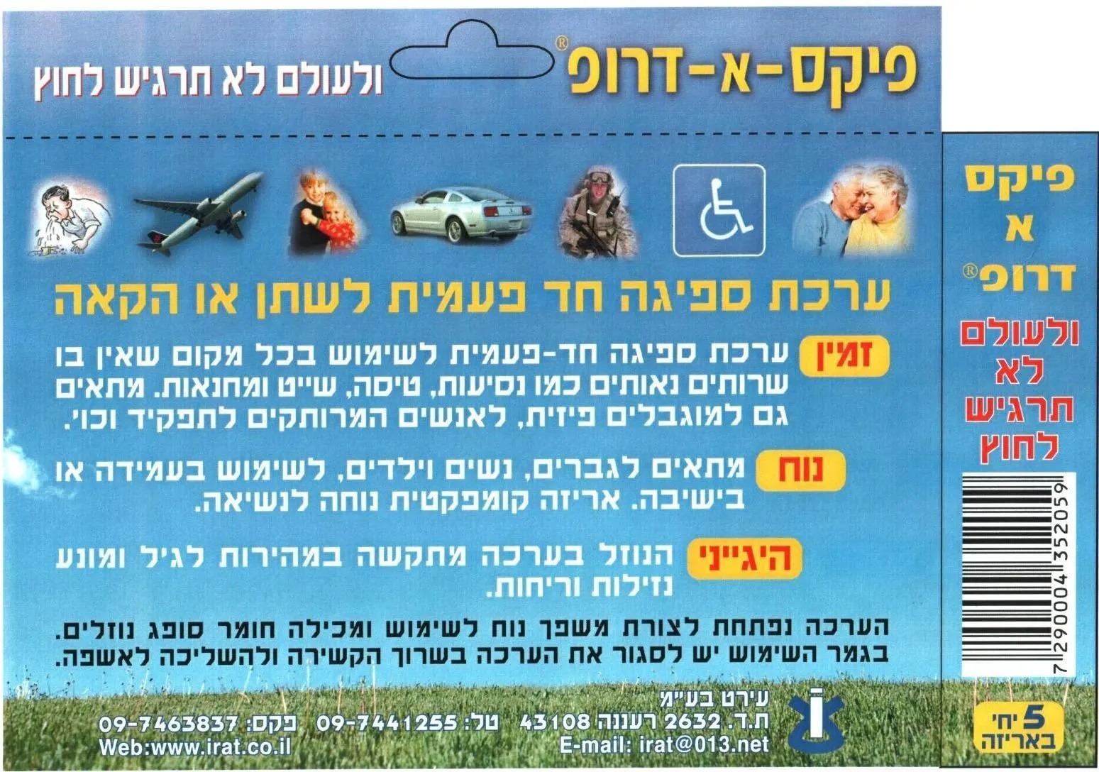 ערכה חד פעמית לשימוש בכל מקום שאין בו שירותים נאותים. ערכת הספיגה נפתחת לצורת משפך ומוכנה לשימוש מיידי. fix-a-drop מהווה פתרון לטיולים בשטח או שהיה ארוכה בחדר סגור. ערכות חד פעמיות החל מ- 13 שקלים לערכה.